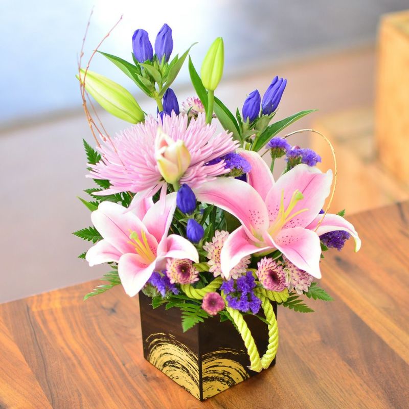 和風アレンジメント、りんどう、紫、百合、敬老アレンジメント、誕生日、記念日、敬老の日、プレゼント、退職祝い、退院祝い、お見舞い、豪華、敬老の日のプレゼント、花