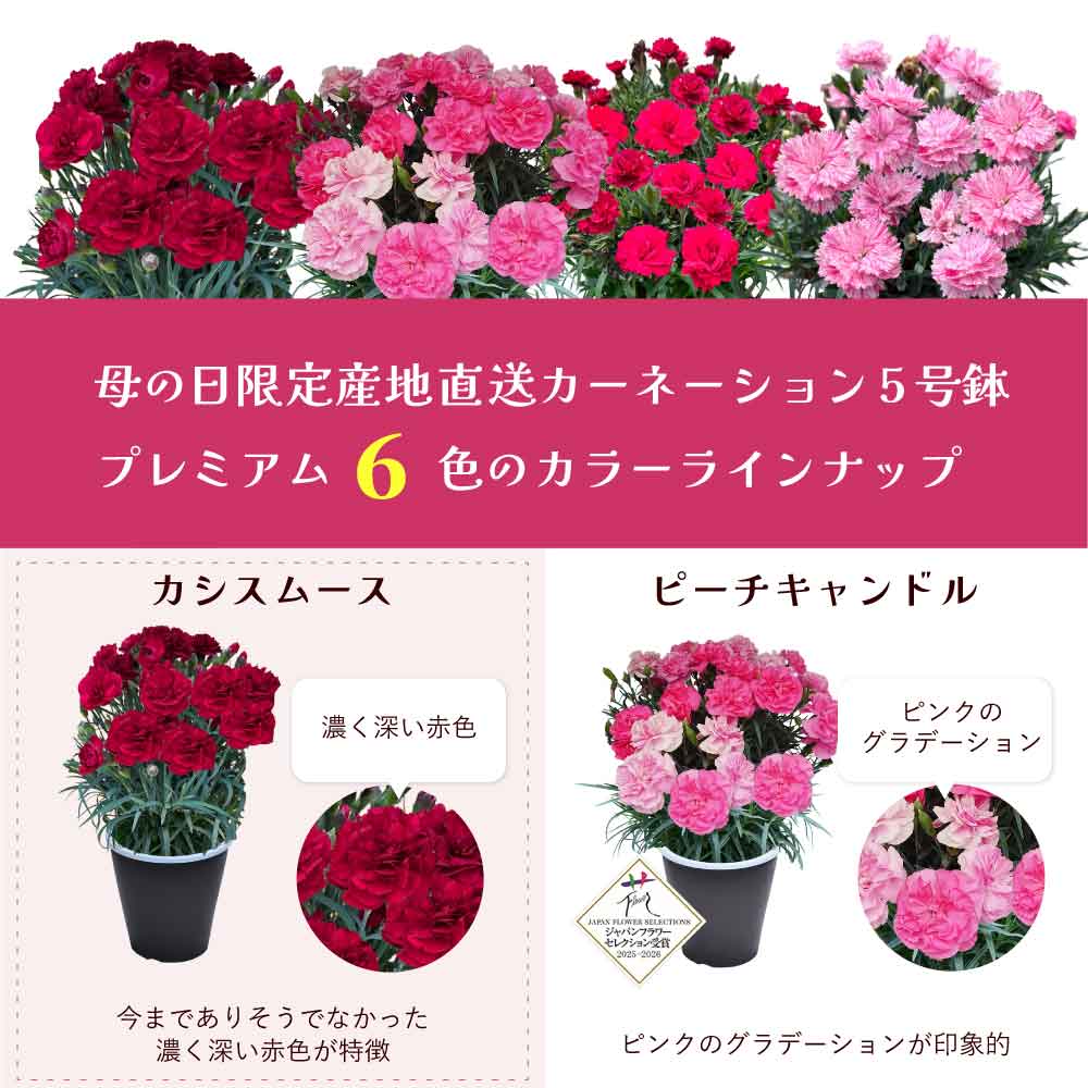 母の日ギフト 6色から選べる最新品種を産地直送で 母の日 産地直送 プレミアムカーネーションの鉢植え 5号鉢 今年の新色 6色
