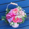 ブリキ缶に生花をふわっと飾った女性人気のお花 ふんわりピンクのアレンジメント