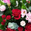 ・赤バラ、トルコキキョウ、カラー、モカラ、季節のグリーンなど