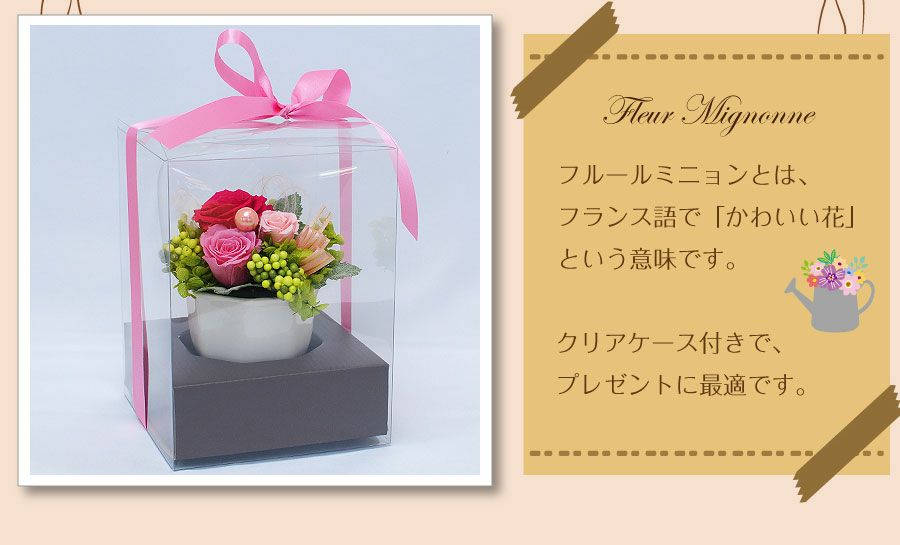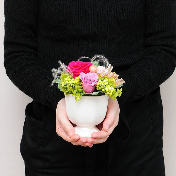 プリザーブドフラワーは、生花を特殊な溶液で加工したものになります。取り扱い環境にもよりますが、約2年程度はお楽しみいただけます。生花のみずみずしさもあり、想い出とともにずっと飾っていただけます。こちらは水やりが不要です。