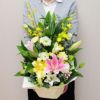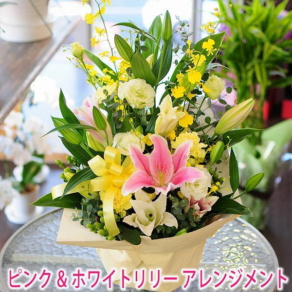白、ピンク、ホワイト、ユリ、ゆり、百合、アレンジメント、結婚記念日、合格祝い、卒業祝い、入学祝い、楽屋花、公演祝い、個展祝い、受章祝い、開店祝い、開院祝い、開業祝い、竣工祝い、栄転祝い、引越し祝い、愛妻の日、母の日、父の日