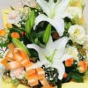 白ユリ、トルコキキョウ、カーネーション、カスミ草、他(季節の花とグリーン)など