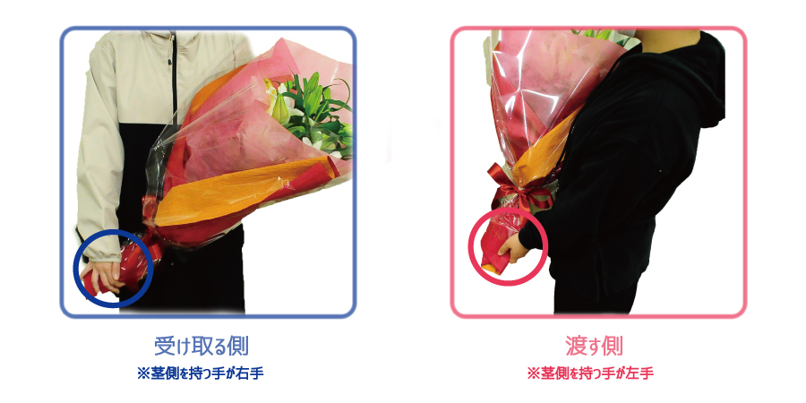 - 相手の右手に茎側、左手にお花が来るように持つ