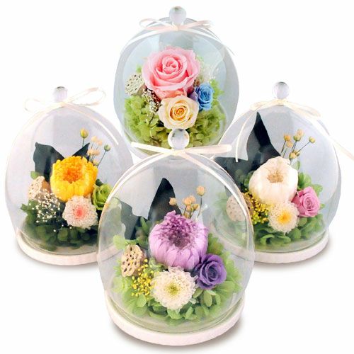 ガラス製のドーム型の中にプリザーブドフラワーのアレンジがはいっています。お供え用の商品です。