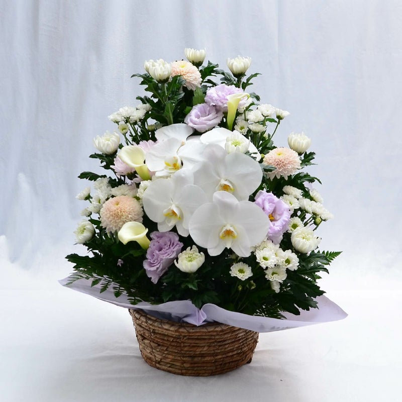 白、ピンク、黄色、青紫系、蘭、ラン、らん、洋蘭、菊、洋花、アレンジメント、お供え花、お盆、御盆、新盆、初盆、お彼岸、春のお彼岸、秋のお彼岸、御霊前、初七日、四十九日、49日、49日、1周忌、一周忌、三回忌、七回忌、十三回忌、十七回忌、二十三回忌、二十七回忌、三十三回忌、命日、枕花、喪中はがきが届いたら、告別式、お葬式、法事、法要、月命日、周忌法要、ご仏前、御仏前、供花、仏花、お供え、御供、お仏壇、お盆、初盆、新盆