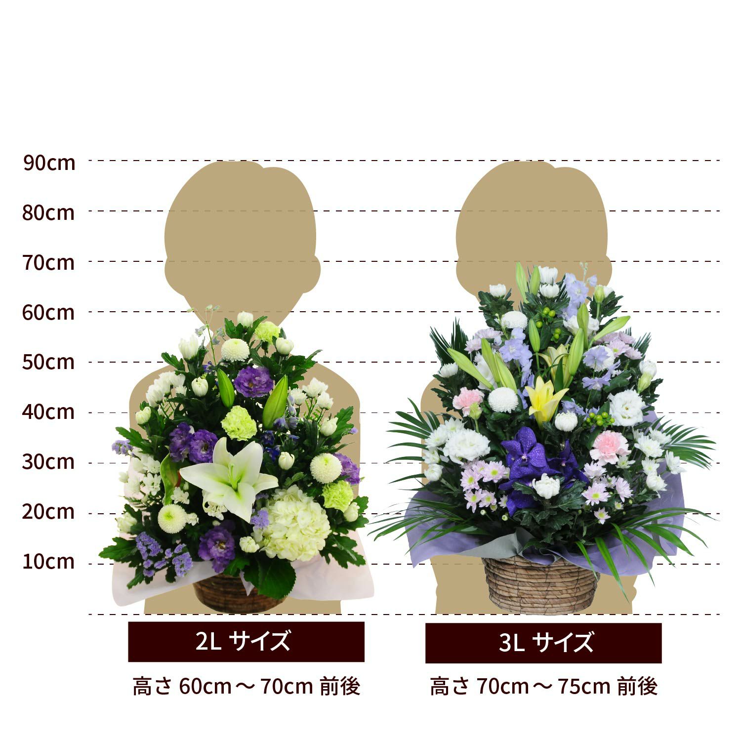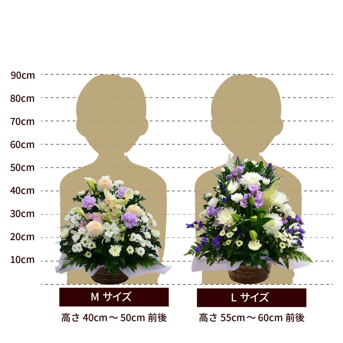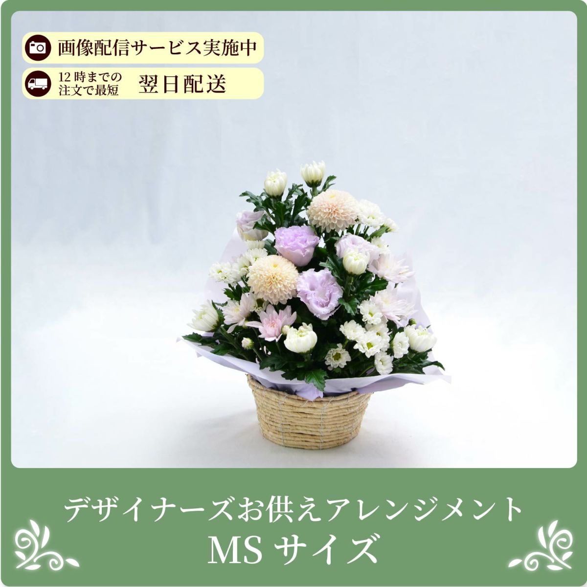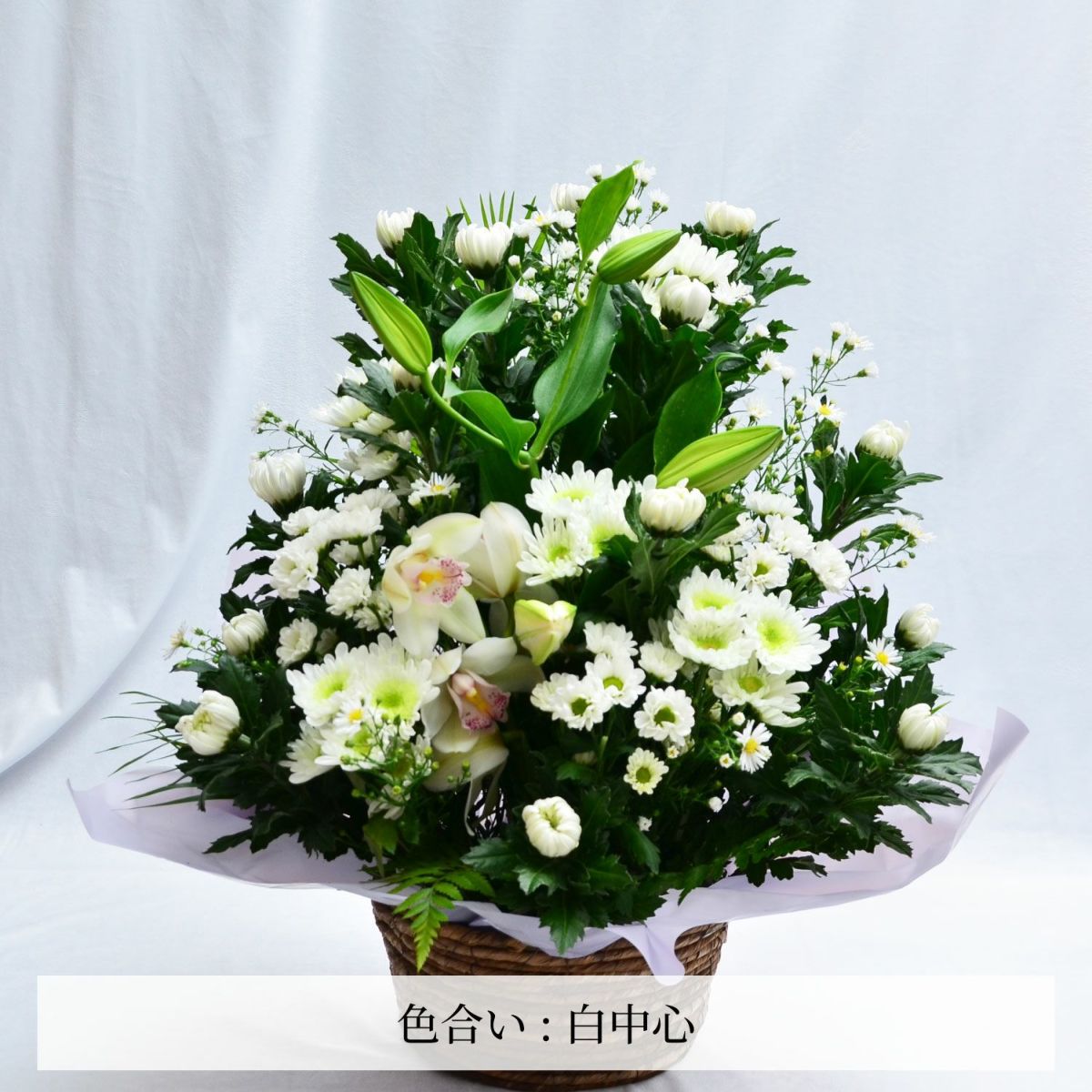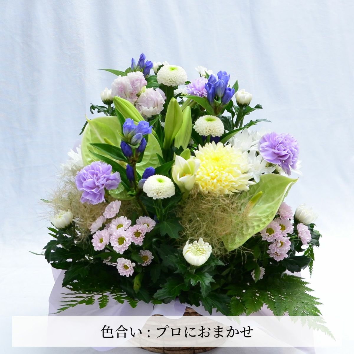 四十九日までに贈る御霊前の花は、白い花が一般的です。ただし、亡くなった故人がお子様だったり、お若い方の時には、白に限らず、温かみのある優しい色合い(淡いピンク・水色など)を選択するお客様も多くいます。「おまかせ」いただいたお花の場合も、お客様からのご要望がない限り、落ち着いたお色に仕上げますのでご安心ください。