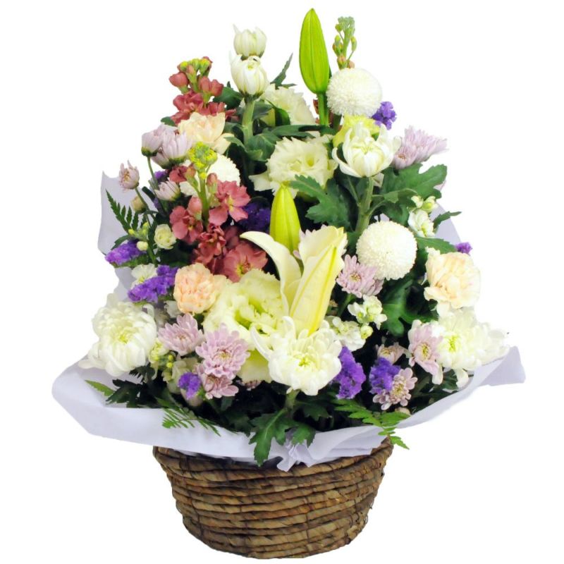 白、ピンク、黄色、青紫系、、ユリ、ゆり、百合、菊、洋花、アレンジメント、お供え花、お盆、御盆、新盆、初盆、お彼岸、春のお彼岸、秋のお彼岸、御霊前、初七日、四十九日、49日、49日、1周忌、一周忌、三回忌、七回忌、十三回忌、十七回忌、二十三回忌、二十七回忌、三十三回忌、命日、枕花、喪中はがきが届いたら、告別式、お葬式、法事、法要、月命日、周忌法要、ご仏前、御仏前、供花、仏花、お供え、御供、お仏壇、お盆、初盆、新盆